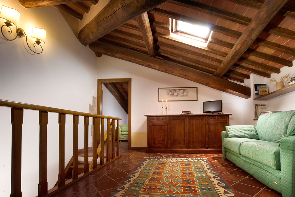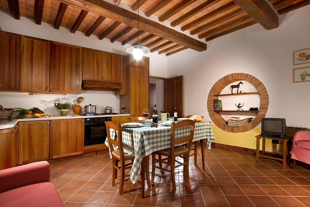 L’appartamento è situato al piano terreno della casa colonica ed è composto da un ampio soggiorno con camino, una grande cucina (frigorifero, freezer, 4 fuochi, forno, lavastoviglie), una camera matrimoniale, una camera doppia, un bagno con doccia ed uno con vasca. Esternamente è presente un ampio spazio in ombra con tavolo e sedie. L’appartamento è dotato di lavatrice.