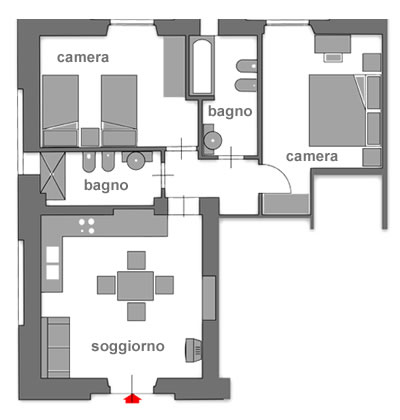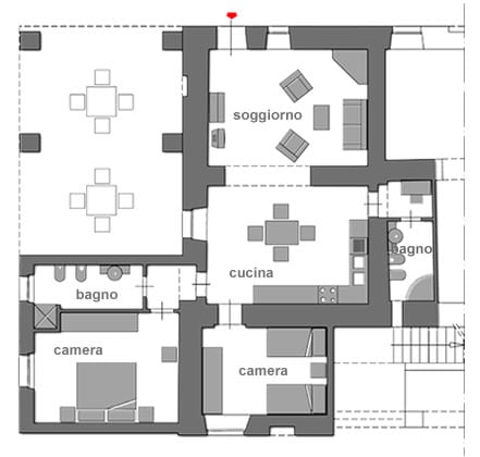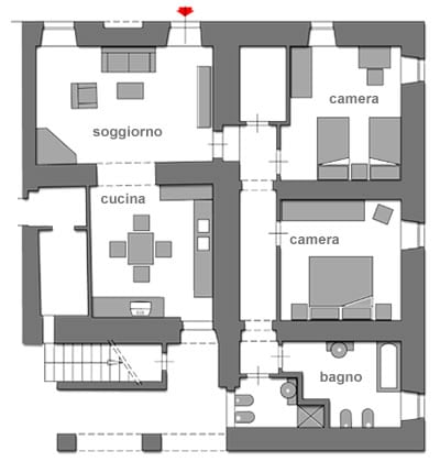 L’appartamento è situato nell’ex fienile ed è composto da un ampio soggiorno cucina (frigorifero, freezer, 4 fuochi, forno e lavastoviglie), una camera matrimoniale, una camera doppia, un bagno con doccia ed uno con vasca. Di fronte all’ingresso è presente un ampio spazio esterno in ombra con tavolo e sedie.