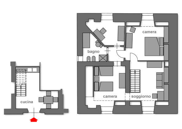 L’appartamento è situato nell’ex fienile ed è disposto su due piani: al piano terra si trova la cucina (frigorifero, freezer, 4 fuochi e lavastoviglie) con il tavolo da pranzo, mentre il primo piano è composto da un ampio soggiorno, una camera matrimoniale, una camera doppia, un bagno con doccia ed uno sgabuzzino. Di fronte all’ingresso è presente un ampio spazio esterno in ombra con tavolo e sedie.