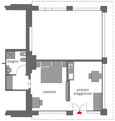 L’appartamento è situato nell’ex fienile ed è composto da un soggiorno con angolo cottura (frigorifero, 4 fuochi, lavastoviglie), una grande camera matrimoniale e un bagno con doccia. Di fronte all’ingresso è presente un ampio spazio esterno in ombra con tavolo e sedie.